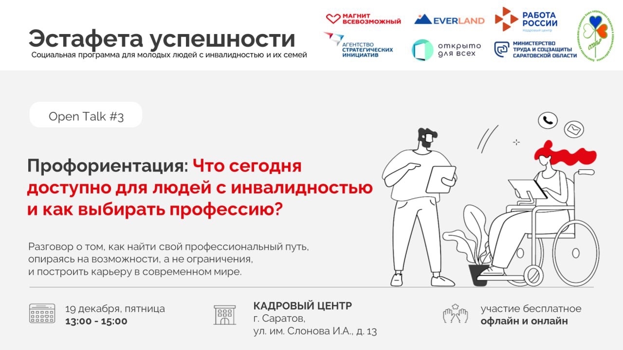 И уже завтра в Кадровом центре Саратовской области (ул. им. И.А. Слонова, 13) пройдет открытая дискуссия «Что сегодня доступно для людей с инвалидностью и как выбирать профессию?».